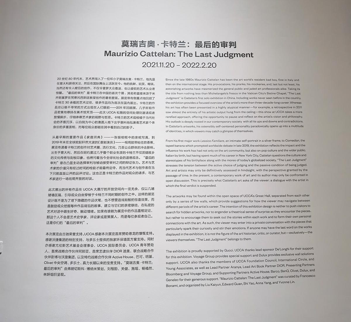 《最后的审判》为莫瑞吉奥 · 卡特兰中国首个个展,集中呈现其三十余年艺术生涯中,29件指涉死亡、社会道德观念、艺术风云人物,以及当代全球化语境下艺术本质和价值等主题的代表作品。