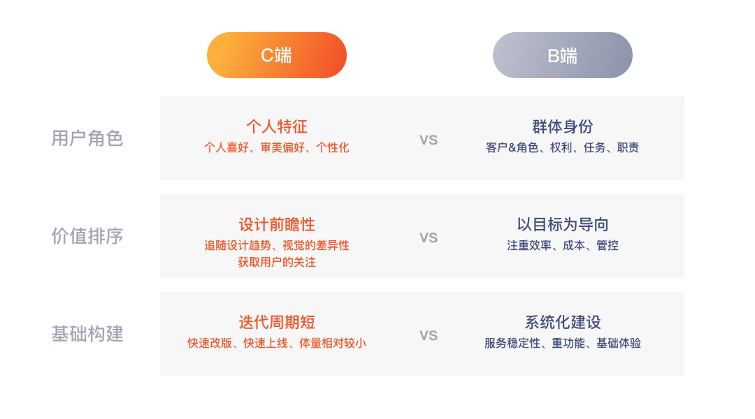 随着互联网C端业务的深度和市场需求挖掘渐趋稳定,各大厂努力寻找C端业务新的增长点,与此同时也在纷纷部署B端业务,而B端与C端产品在商业本质上的不同,B端产品具有较高的业务门槛和业务深度的可持续挖掘性。相对于C端产品来说,B端业务场景、功能逻辑、用户构成等各方面都更较为复杂,在业务理解、产品认知、视觉表达、交互能力、逻辑思维层面上也更具有挑战性。