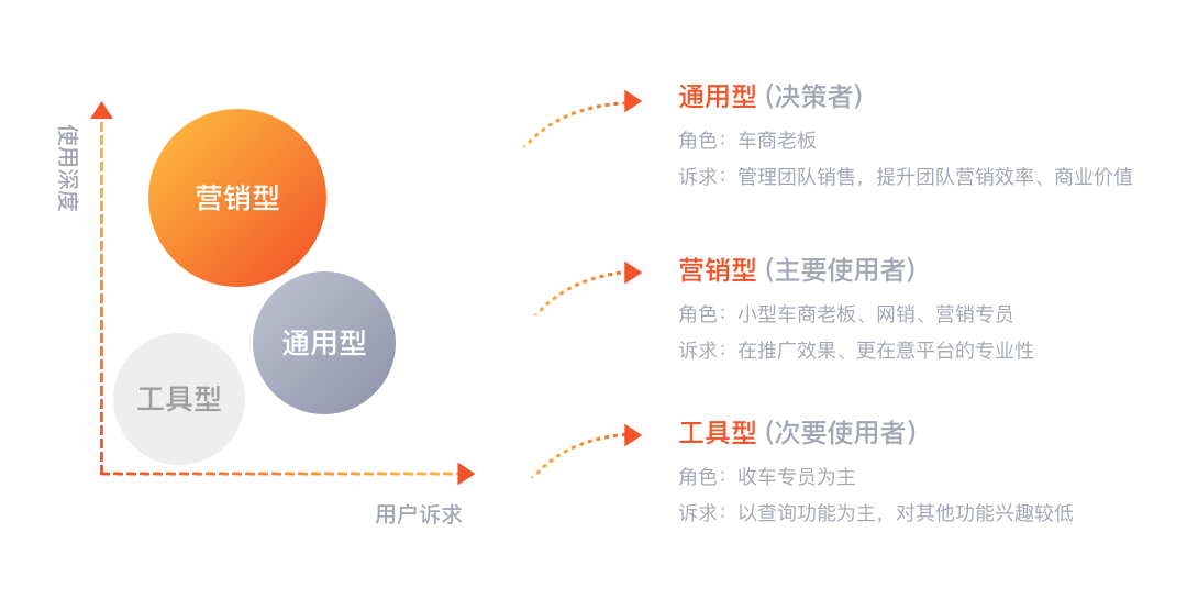 举个例子(58二手车B端产品车商通)B端产品来说,线上用户按使用深度划分角色为3类:通用型(车商老板)、营销型(车商老板、网销、销售)、工具取向型(收车专员)。