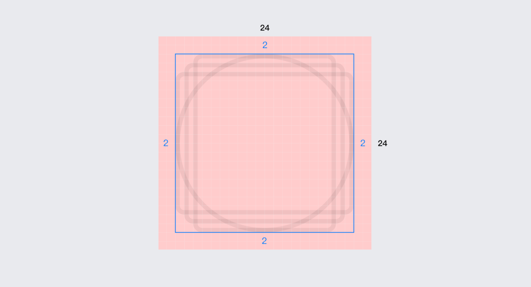 在24*24的画板内,边距预留2px后,蓝色矩形框中为安全区域,方便规范图标大小。