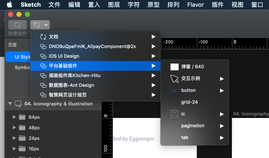 在sketch的插件中可随时查看图标项目和调用相应的图标。