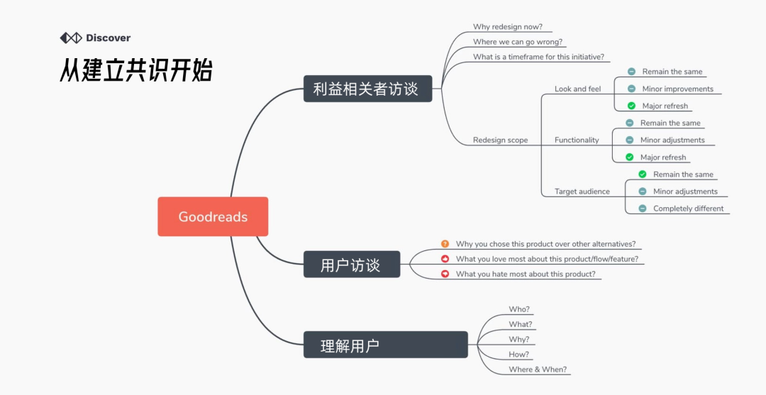 作为设计师,你的角色是使每个人都在同一页面上,为了一个共同的目标团结起来。首先,与项目利益相关者进行访谈,了解我们当前处在什么阶段,以及为什么要努力实现业务目标。调研他们对外观,功能和目标受众的期望。与开发人员和相关团队进行面谈也是一个好主意,这样可以更深入地了解问题。
